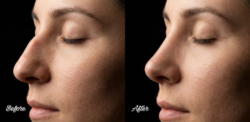 The filler instantly fills space under the skin, where, once injected, it adds the slightest amount of volume to lift depressions or fill out irregular shapes. The filler is a temporary scaffold, which slightly elevates the nose bridge, smooths out small bulges, or lifts the tip to make the nose more proportional and in balance.